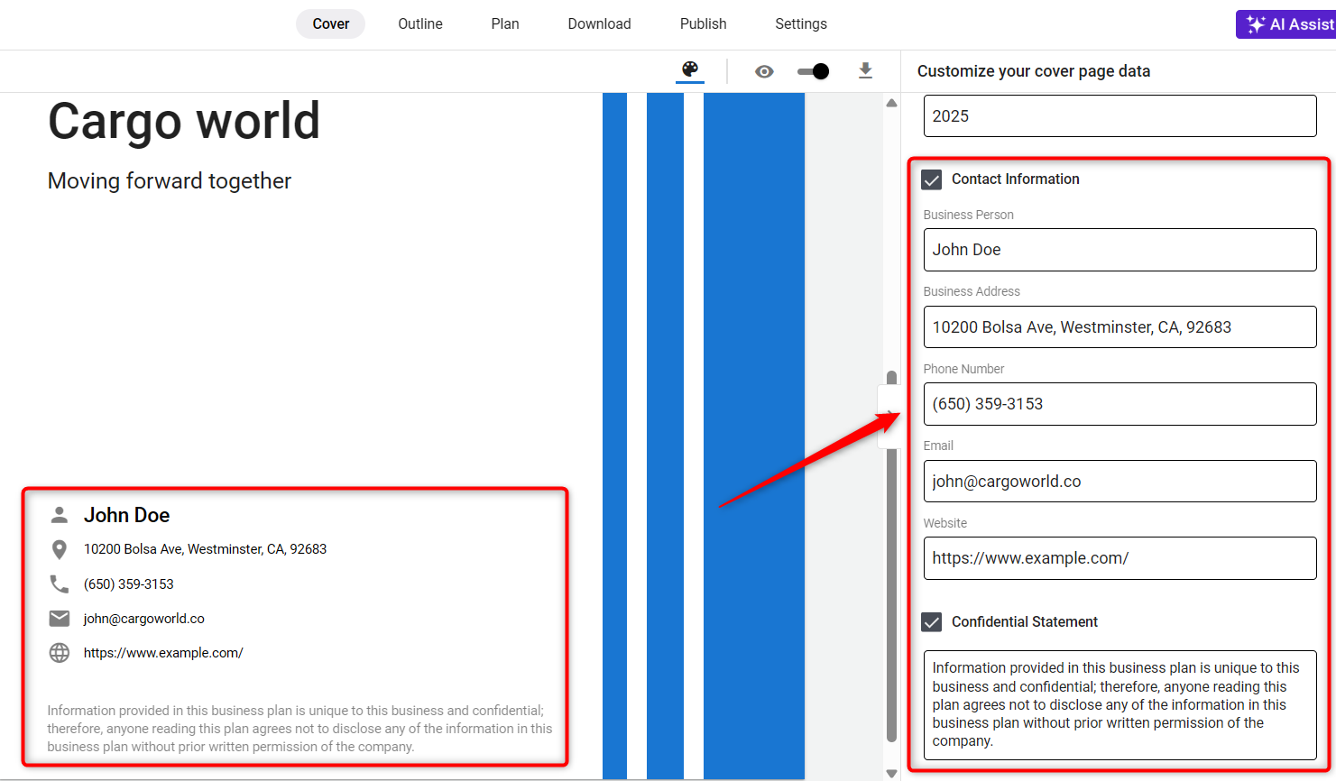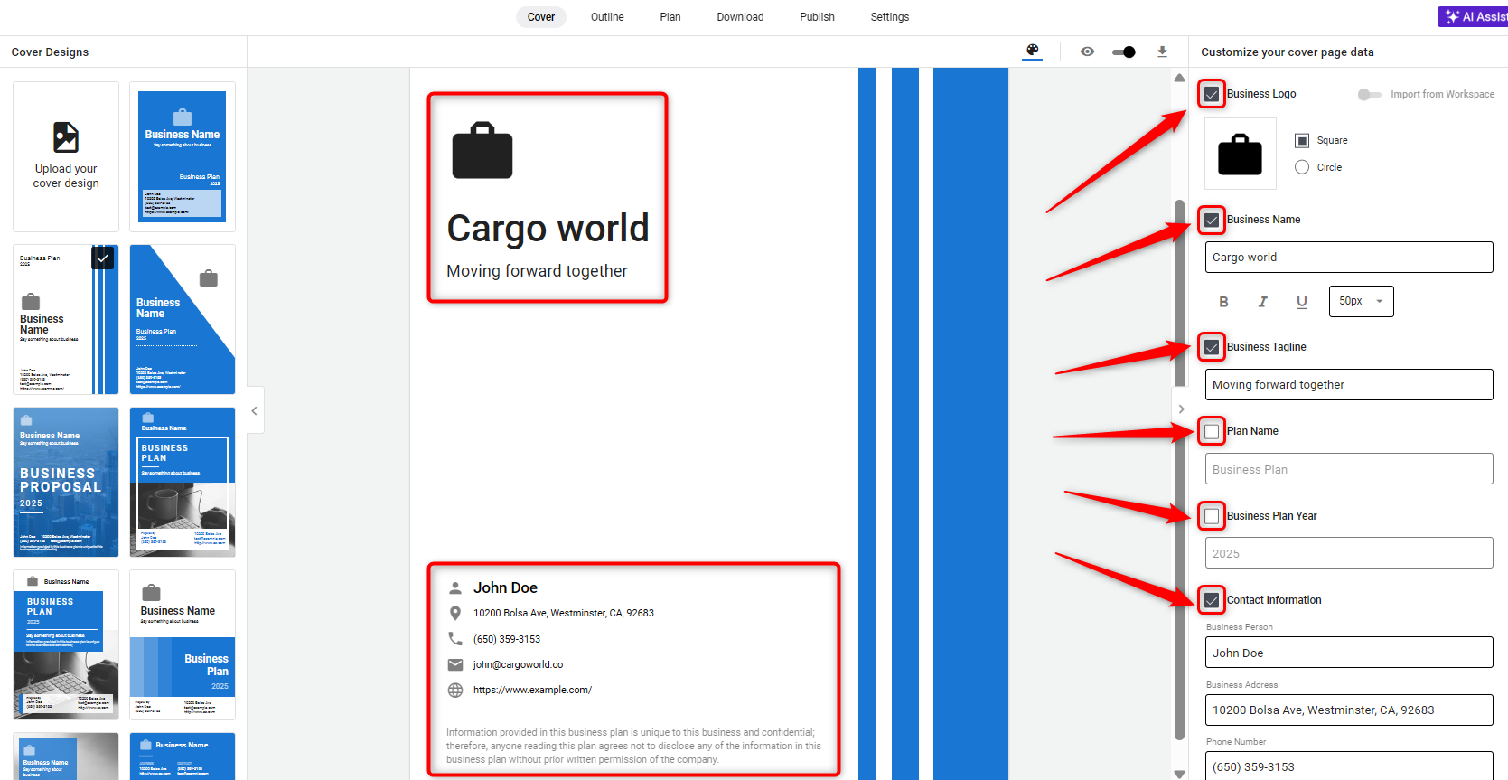Select the sections you want visible on your cover page to tailor it to your business’s unique aspects.