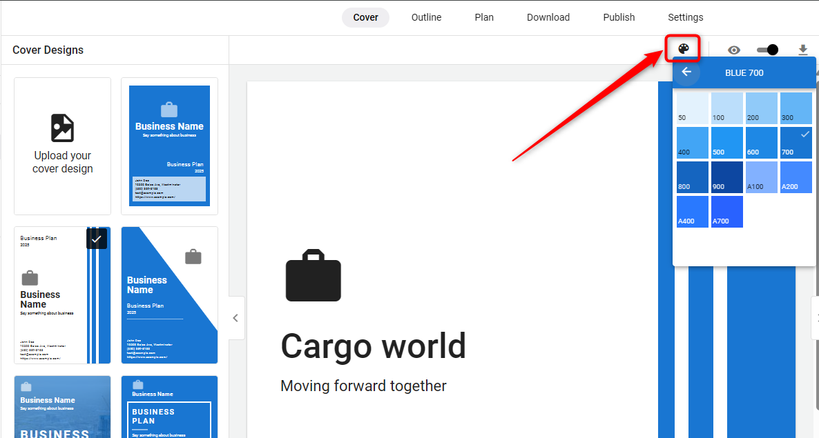 To further personalize your cover page, we provide the option to adjust the color scheme. Select a color that matches your brand identity or the mood of your business plan.