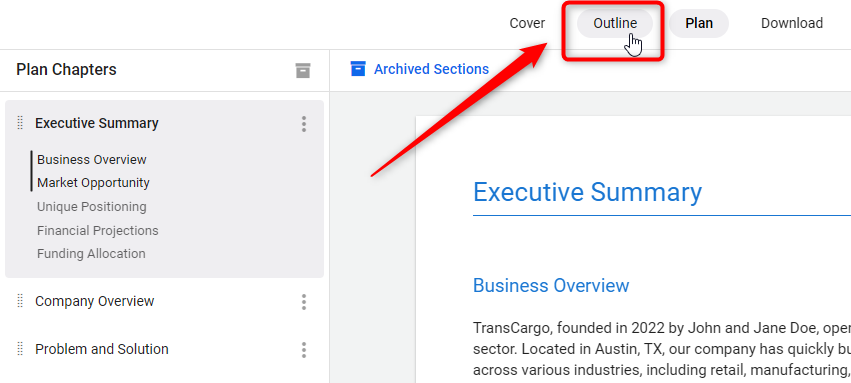 - Once your Appendix is in place and your business plan is complete, you can share it directly with stakeholders or export the entire plan, including the Appendix, into a shareable format like PDF or DOC.