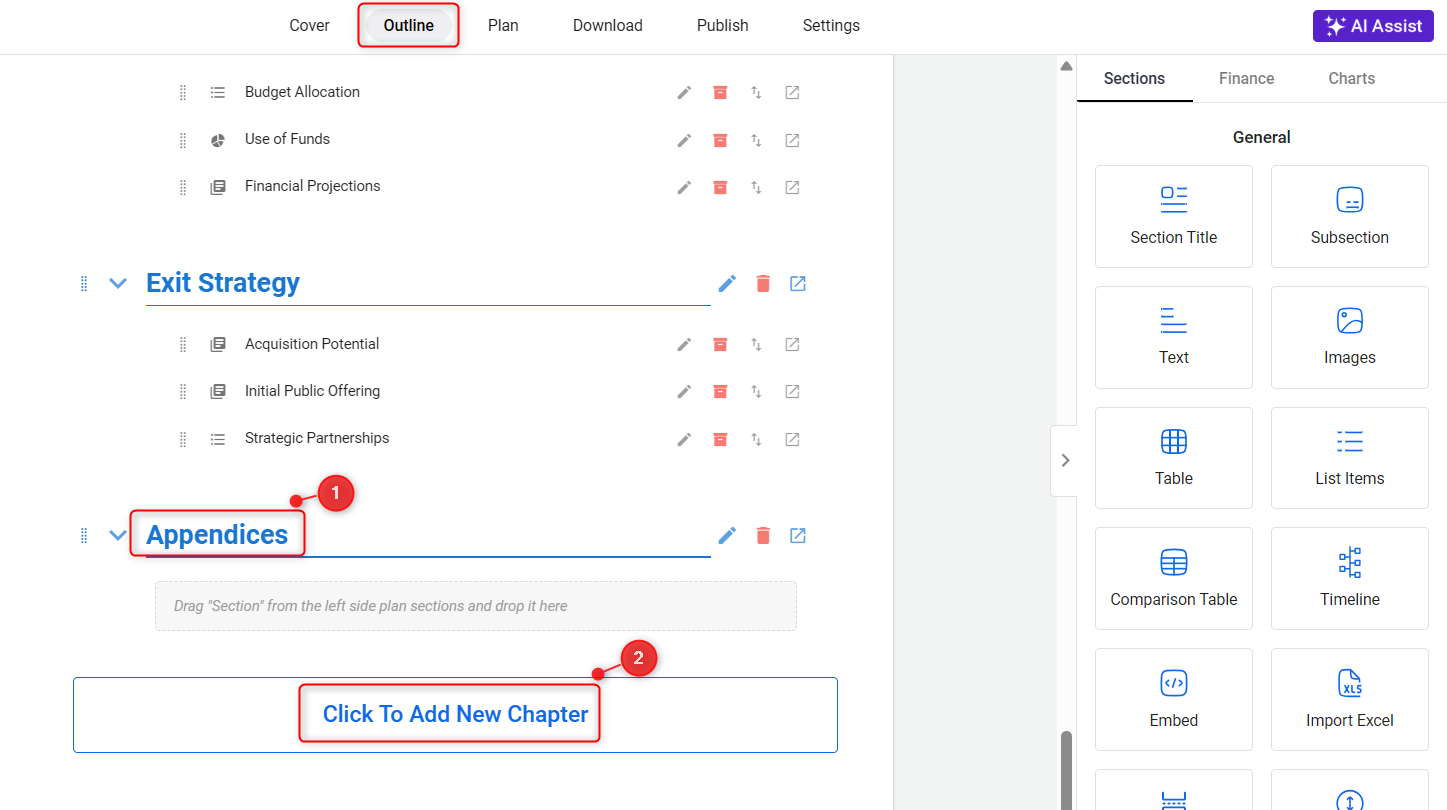 Here, You can add a new chapter by clicking on Click to add New Chapter at the end of your plan and label it as an Appendices>."