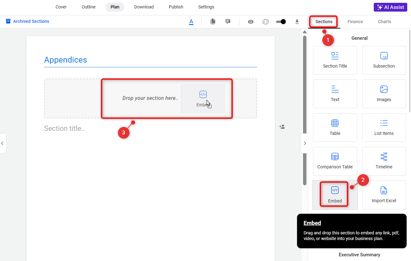Use drag-and-drop to the Embed section to add videos, PDFs, Excel, and Doc files into your plan via links or direct uploads, enhancing your business plan's depth and accessibility.