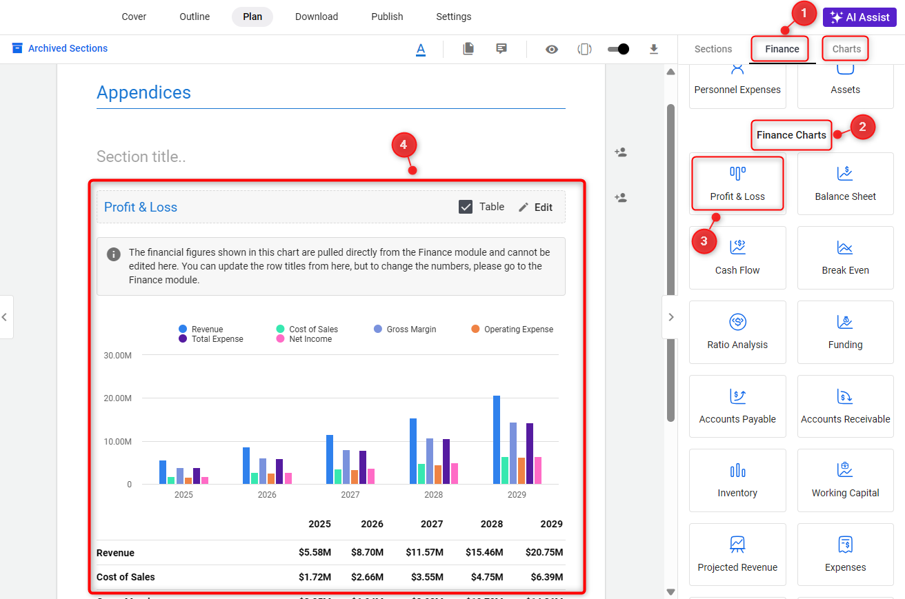 Through the finance or charts section, utilize the drag-and-drop function to add essential charts and reports to your business plan, providing clear visual representations of your financial data.