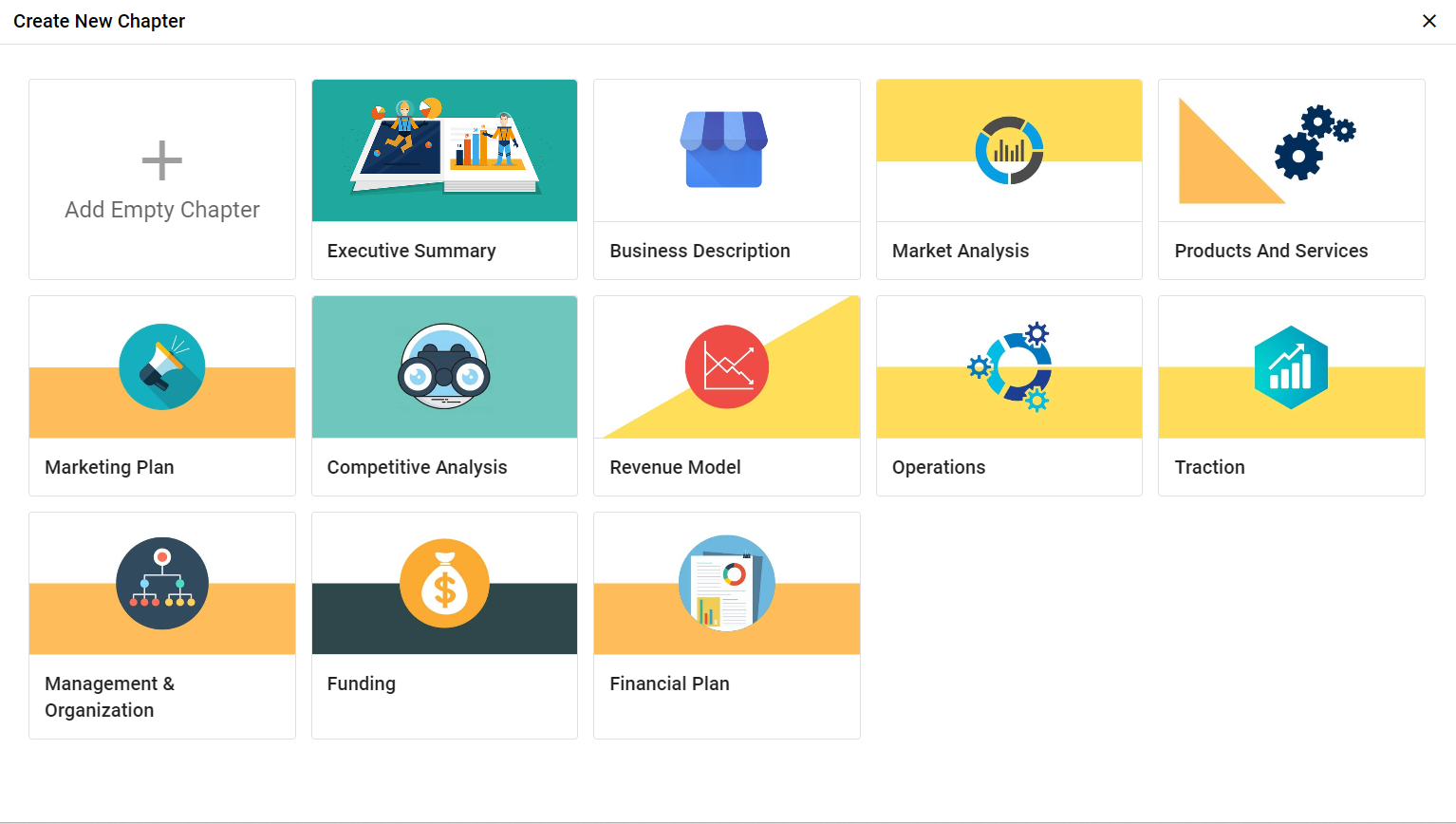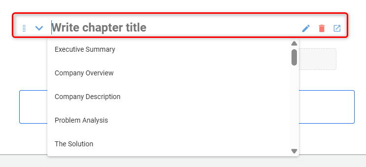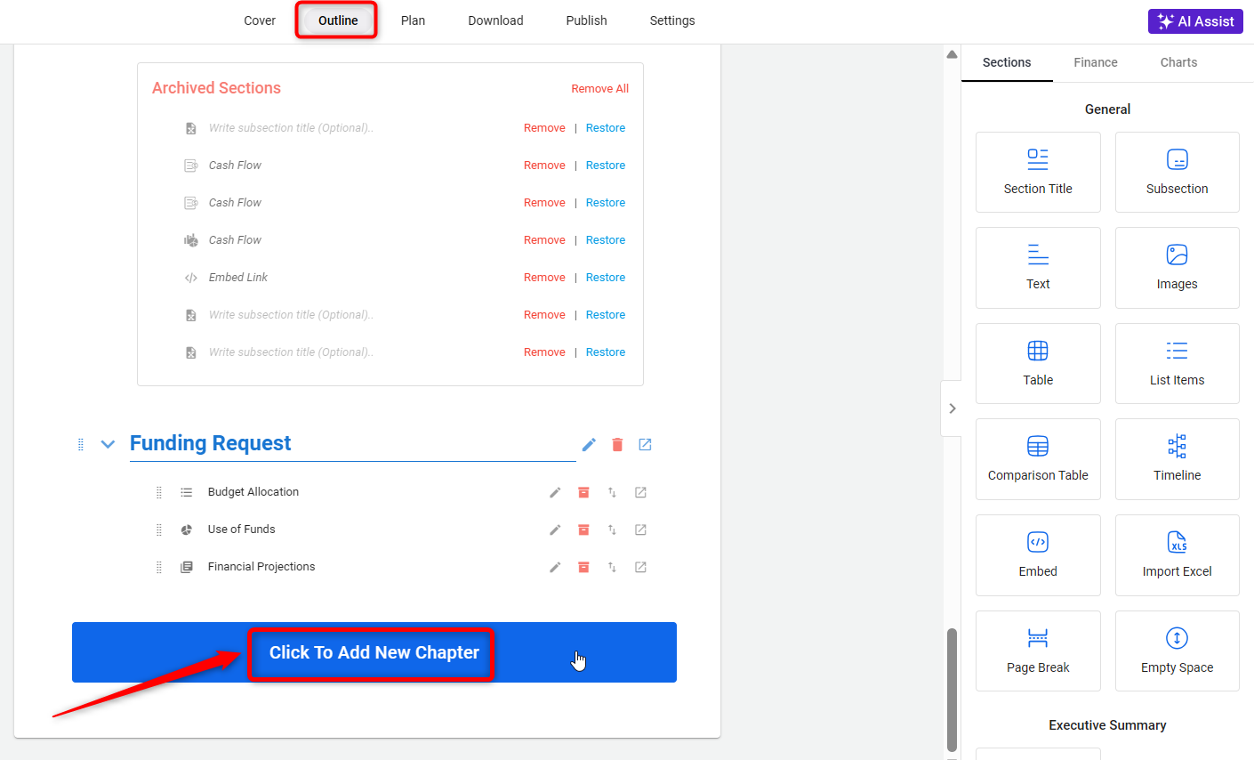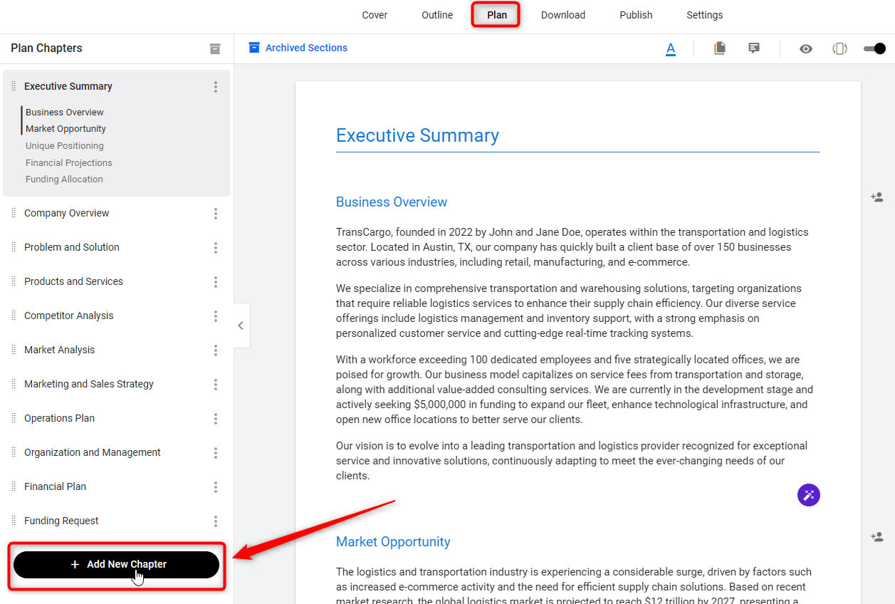 The Outline Section serves as the backbone of your business plan. To add a new chapter to this section, follow these simple steps: