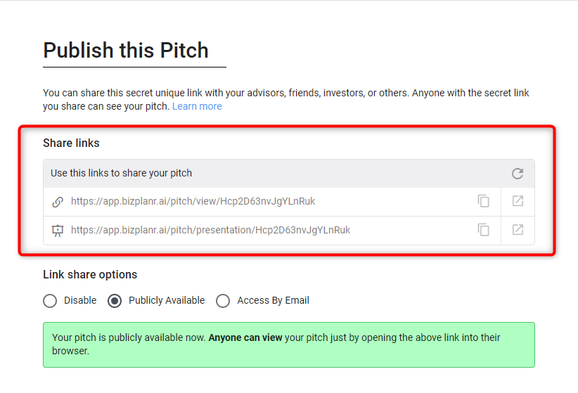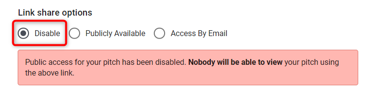 - Disable: If you wish to keep your pitch deck private or temporarily restrict access, you can disable the sharing links.