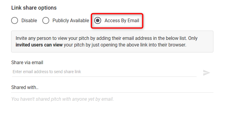 - Access By Email: For added security, you can require viewers to provide their email addresses before accessing your pitch deck. This option gives you more control over who views your presentation and can be used to track interest.