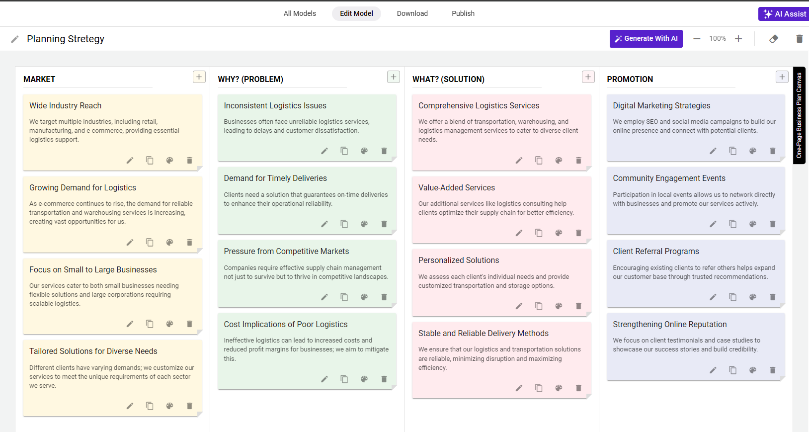 Streamline your strategic planning with the AI Assistant. This tool allows you to generate a detailed Strategic Planning Model in just a few minutes, saving you time and enhancing your strategic output.