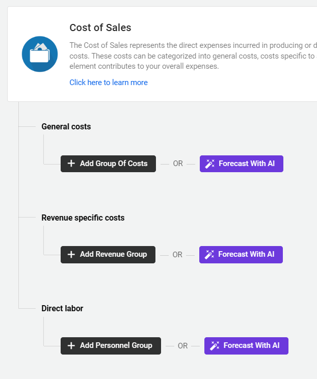 We give you three ways to forecast the cost of sales General costs, Revenue-specific costs, and Direct personnel costs (Direct labor). The cost of sales form guides you on how to enter/edit the cost of sales data: