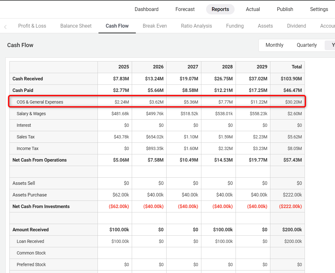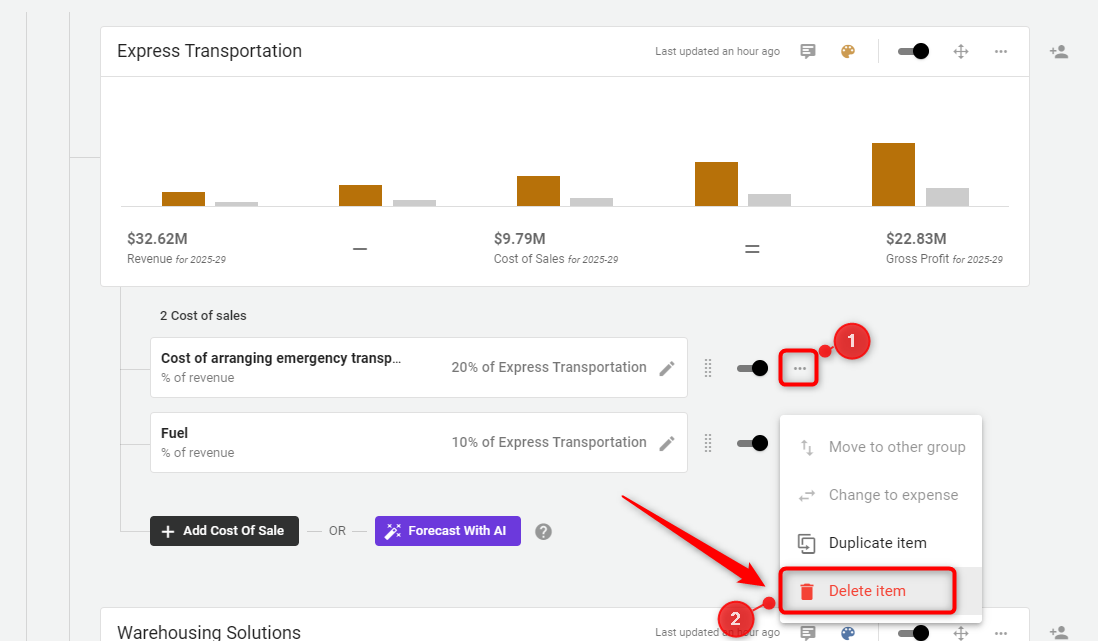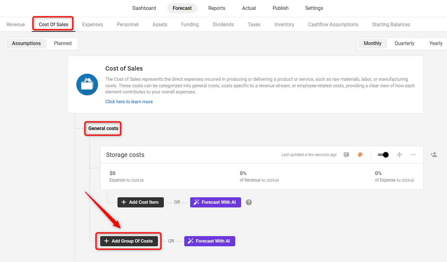 In your financial forecasting tool, Under a Revenue Stream Click on Add Cost Of Sales option: