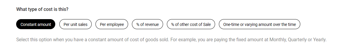 - Constant Amount: Select this option when you have a constant amount of cost of goods sold. For example, you are paying a fixed amount at Monthly, Quarterly or Yearly.