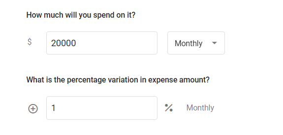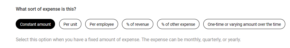 - If you choose a Constant amount, enter the amount you'll spend on this expense per day, per month, per quarter, or per year. Also indicate the percentage variation in expense amount.