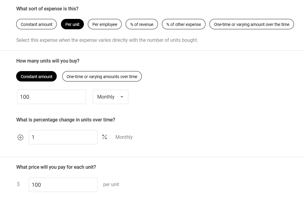 - If you choose a Per Unit, opt for this method when your expenses vary based on how many units you buy:
