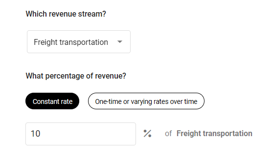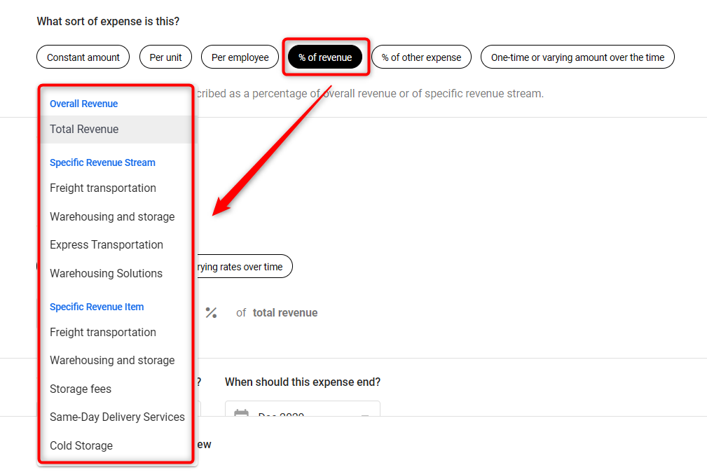 - If you choose % of Revenue, select Total revenue or any specific revenue stream that the expense is related to. Indicate the percentage of overall revenue or this revenue stream that should be allocated for this expense:
