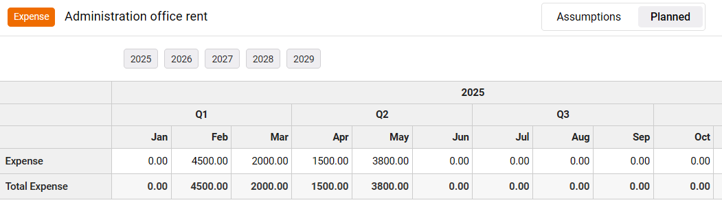 In the Expenses section of the forecast, you’ll estimate your regular monthly, yearly, and even one-time operating expenses – rent, utilities, insurance, marketing costs, office supplies, and so on. The expenses entered here are short-term; that is, they are typically used up within the period in which they are paid. For example, paying rent in January provides you with value in January but not in February or beyond.