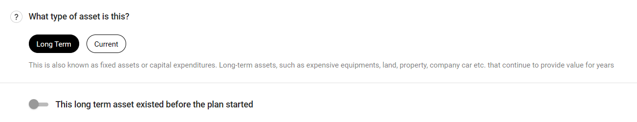 Choose the Long term for the asset type and enable the toggle if the assets were in place before the start of the plan.