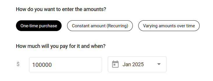 - If you choose a One-time purchase, enter the expected purchase price and purchase date: