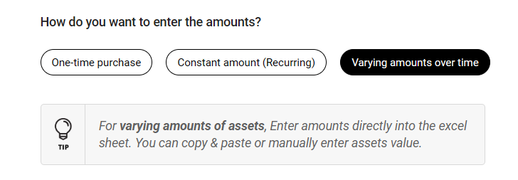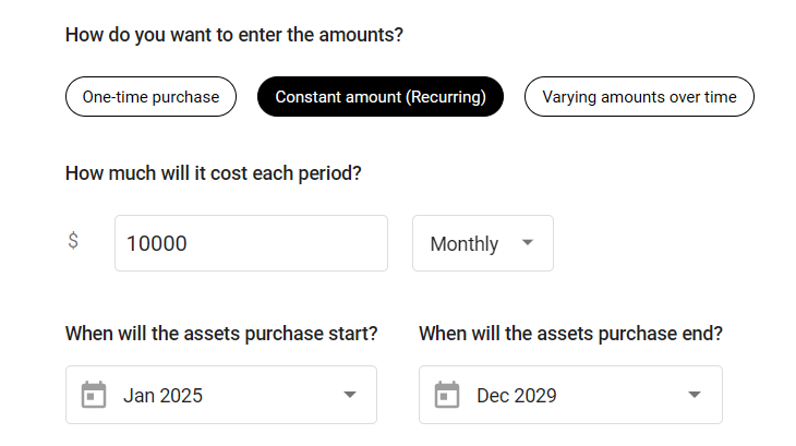 Choose how you want to enter the asset. Will you pay a one-time amount for it, pay the same amount per month/year for it, or pay varying amounts per month/year for it?