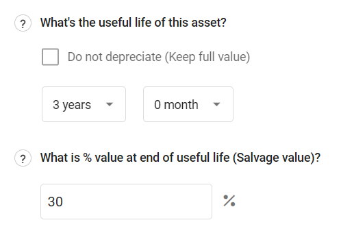 Depreciation: Indicate the useful life of the asset, which will help calculate the depreciation. If this asset won't depreciate, choose Forever (do not depreciate) at the bottom of the list: