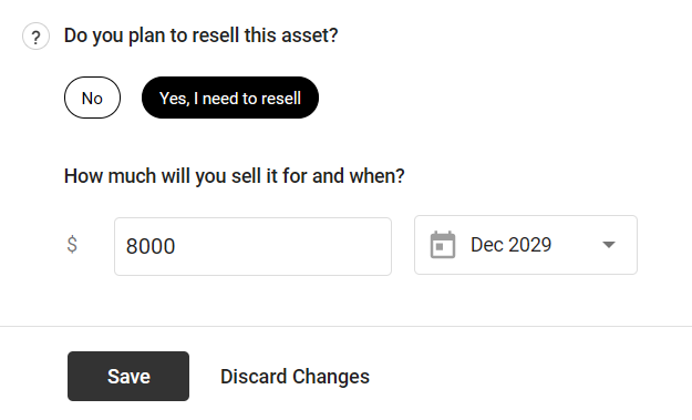 Finally, if you chose " One-time amount" on the previous step of the overlay, you'll see an option that asks you to indicate whether you plan to sell this asset during the period covered by your forecast, and if so, when:
