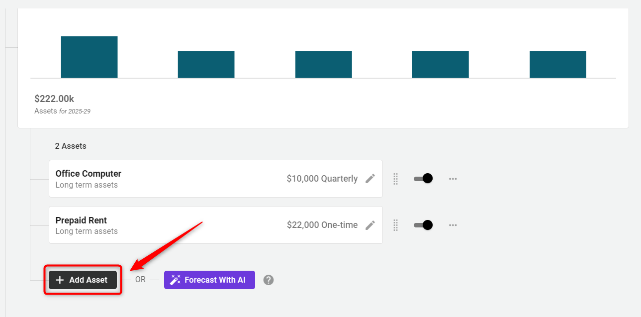 NOTE: Not all assets are covered here. Cash, accounts receivable, and Inventory are assets too, but we address those separately in our forecast. Just focus here on long-lasting purchases like equipment, vehicles, or furniture. You can also use this feature to spread out the expense of annual contracts or other short-term assets.