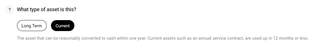 Click Current to indicate that this is a current asset and turn on the toggle if the assets were in place before the start of the plan.