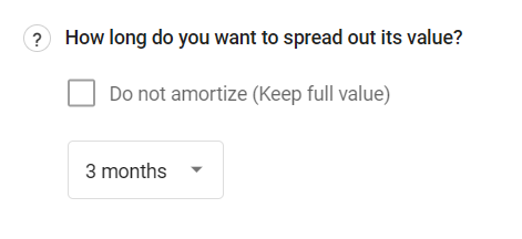Select the length of time that this current asset will provide value, so the system can amortize that value. If you don't want to amortize it at all, choose the Do Not Amortize (Keep at full value) option at the bottom of the list and click on Save.