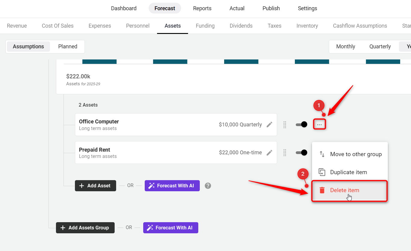 Under the Forecast tab of the financial forecasting tool, Click on the Assets tab, and then click on the Add Assets Group. A popup will appear and Add the assets group name.