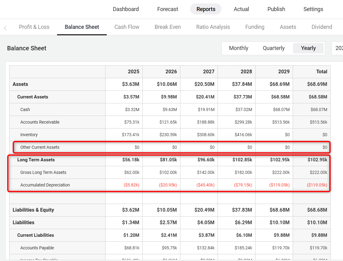 Assets can be entered as Current Assets or Long-term Assets, and these two entries appear in different parts of the financials. In the Profit and Loss table, only the depreciation and amortization of an asset will be listed, as this is the only part of the asset that's considered an expense of daily operations.