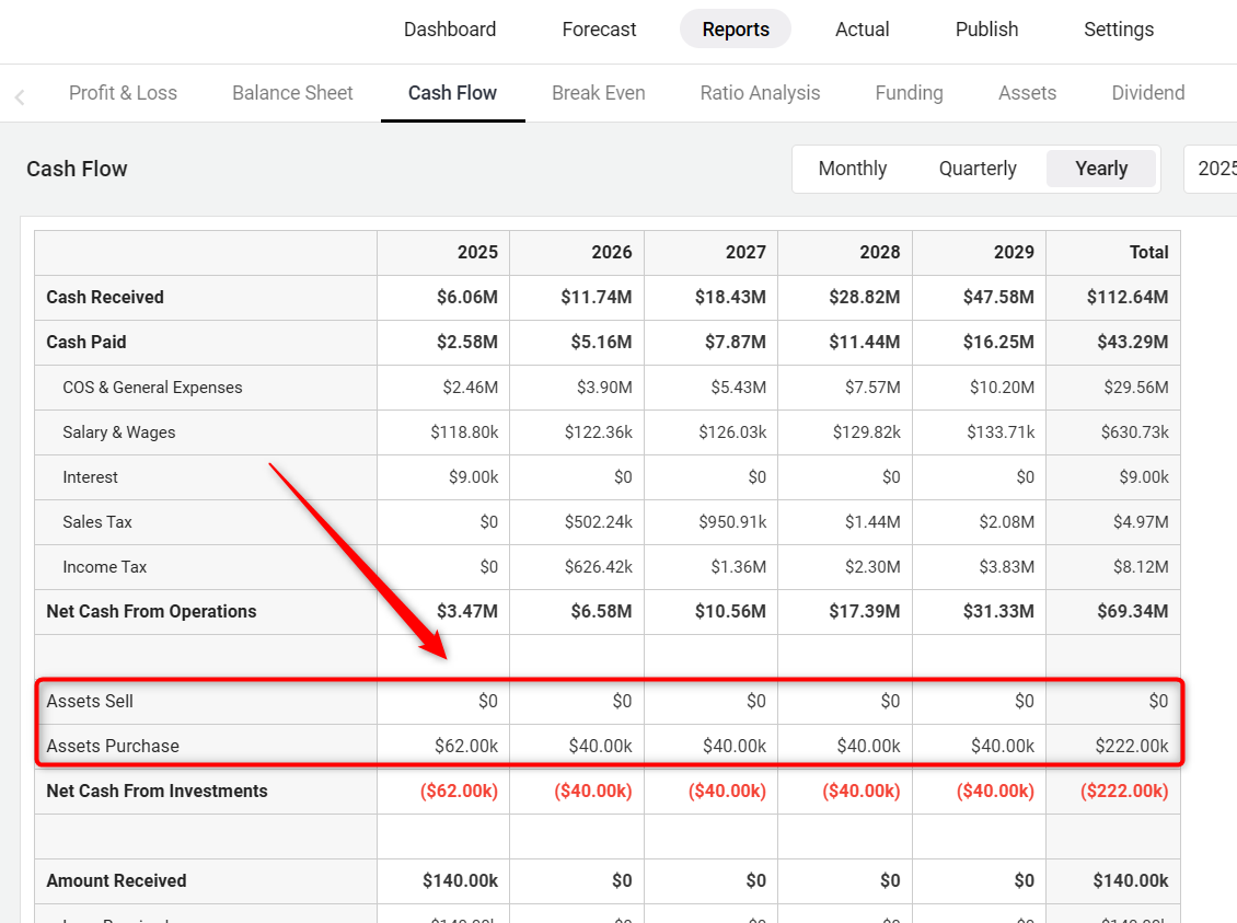 In the Cash Flow statement, both short-term and long-term assets will appear as shown below. The value of the Asset Sell and Asset purchase appears in the Cash Flow as below: