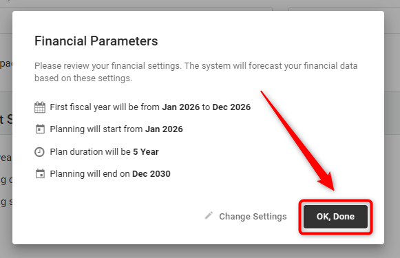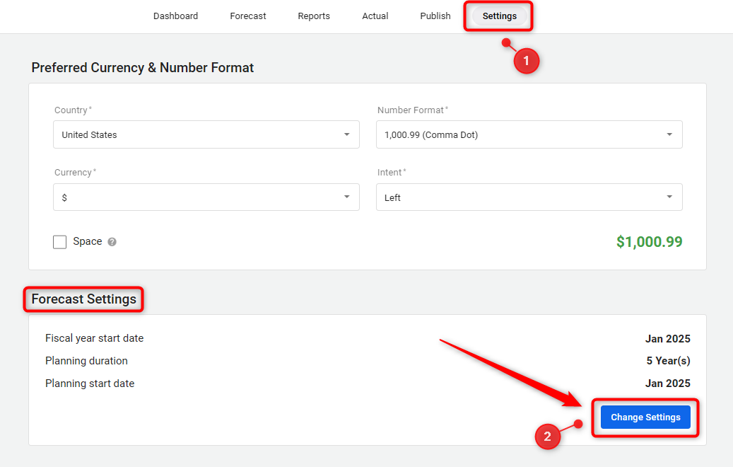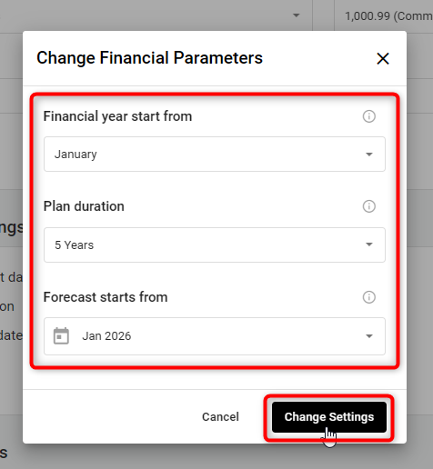 In Settings, find Forecast Settings and click on the Change Settings option. This action will open a pop-up window where you can update key financial planning parameters.