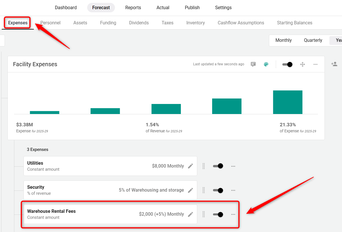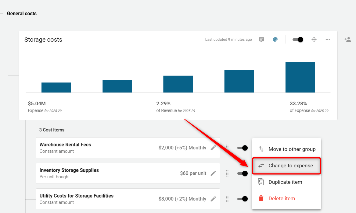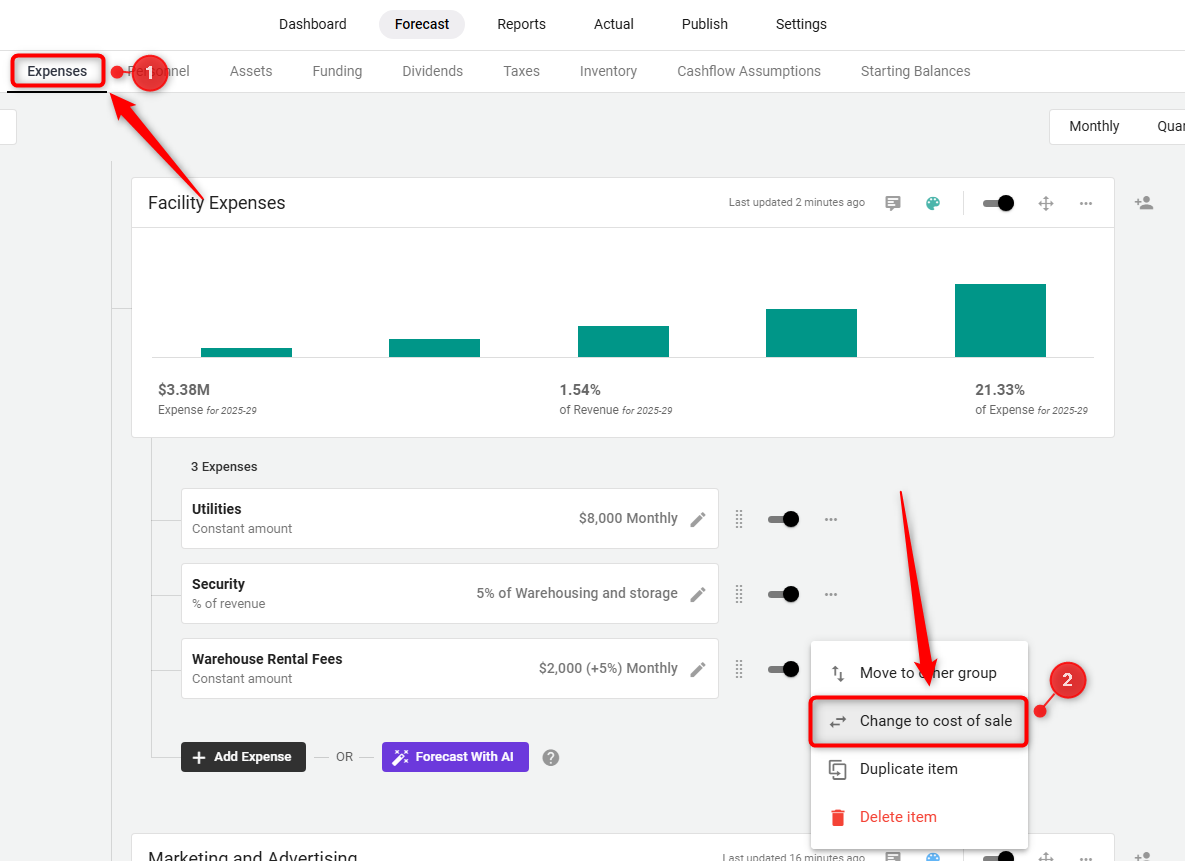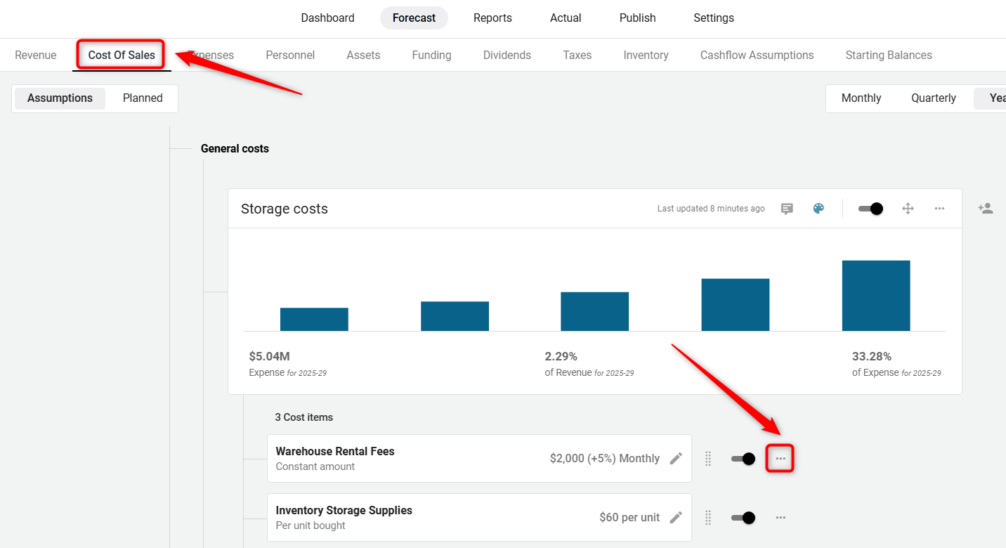 Open the financial forecast module. Choose either the Cost of Sales or Expenses tab depending on where your item is currently categorized.