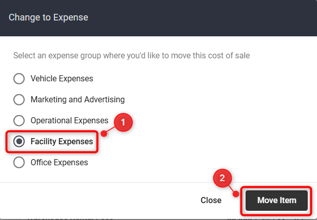A popup will appear and display the available groups within the destination category (either Expenses or COS). Click to select the group where you want the item to be relocated.