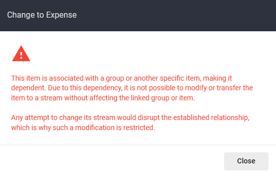If you find that certain finance items are linked or dependent on others in your finance, that certain items cannot be moved independently within your financial structure. If you attempt to move an item that is a dependent (child) of another item (parent), the move will not be processed as expected.