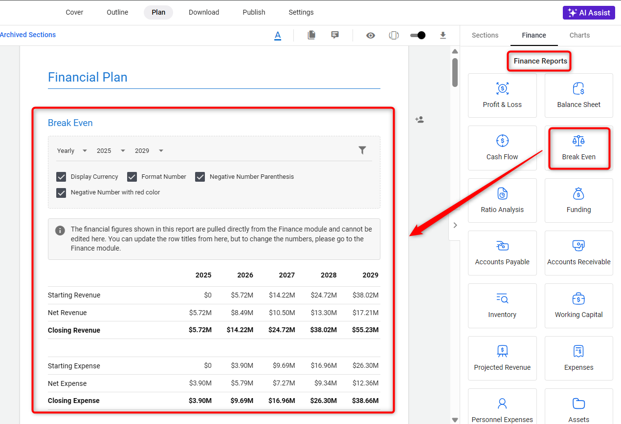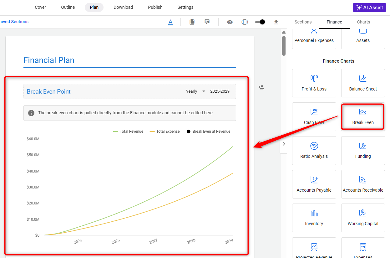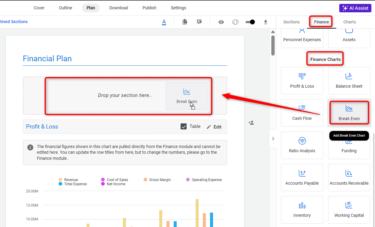 In the Finance section, look for the ‘Break-Even’ option. Utilize the drag-and-drop feature to add a Break-Even Analysis to your business plan.