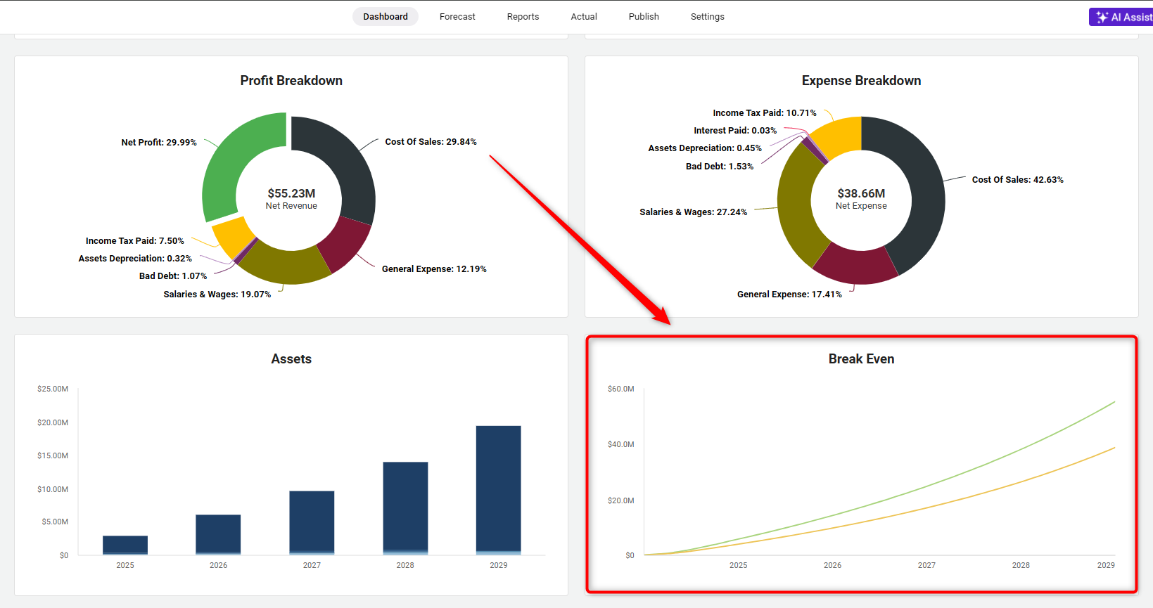 Moreover, you can also view the Break-Even Analysis on the dashboard section of the Finance Forecast module. This visualization helps you understand at a glance when your business is expected to start generating profit beyond just covering expenses.