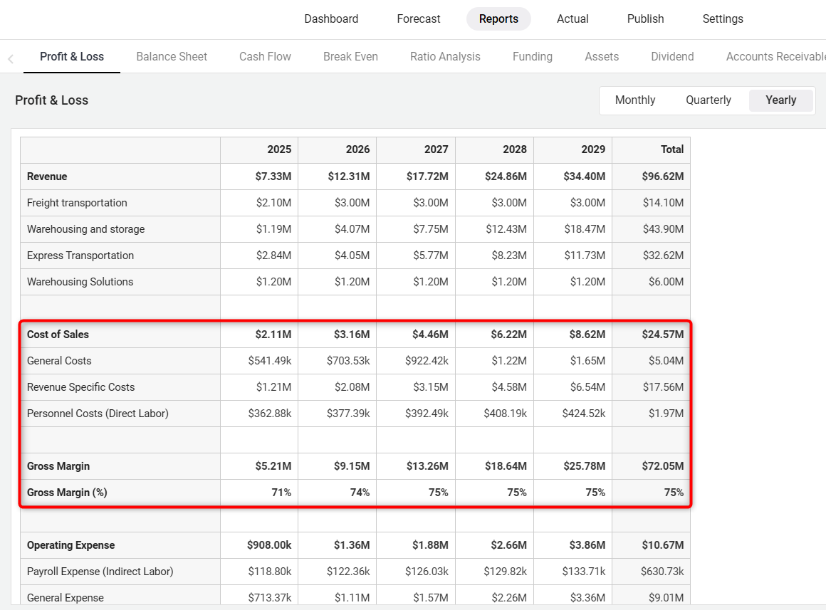 You can see the Cost Of Sales in the sample Profit and Loss statement below. They are calculating against the Revenues to arrive at the Gross Margin, which is the overall profit margin of the product or service: