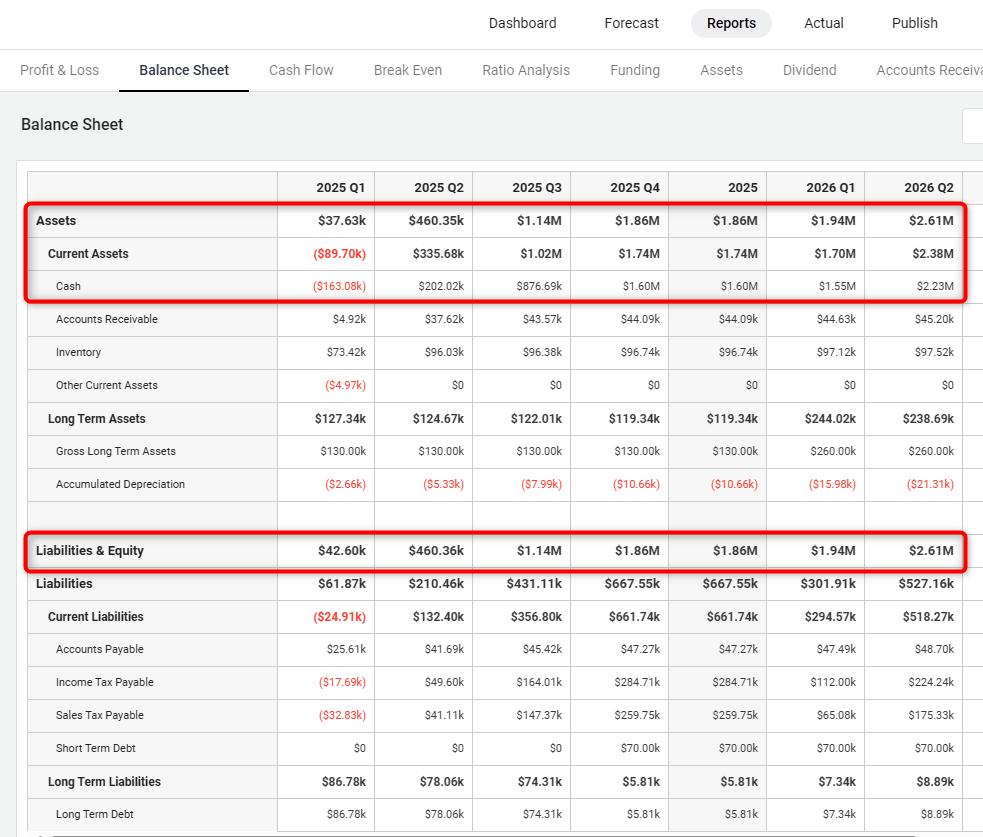 In the Balance Sheet, your personnel entries are calculated as a negative number in your Assets. And then, because the Balance Sheet always has to be in balance, this value will also appear in the Liabilities and Equity portions of the table.