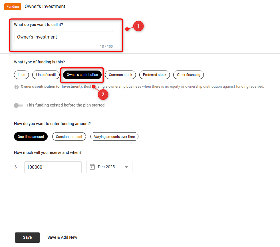 If the investment comes directly from the owner, or founder, as a personal investment, use the "Owner's Contribution" option to add this amount.