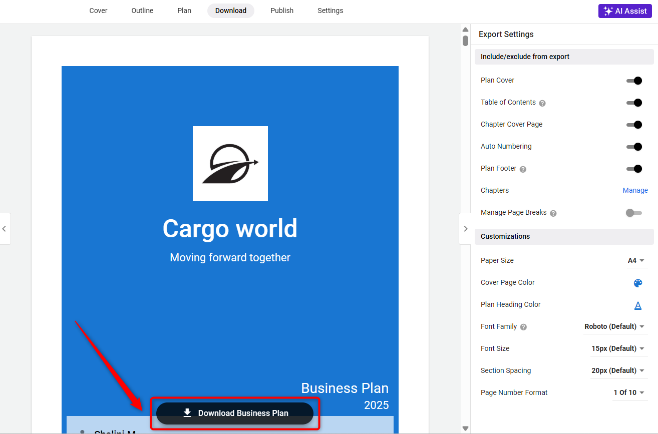 Preview your business plan and click on the Download Business Plan button located at the bottom-right corner of the page: