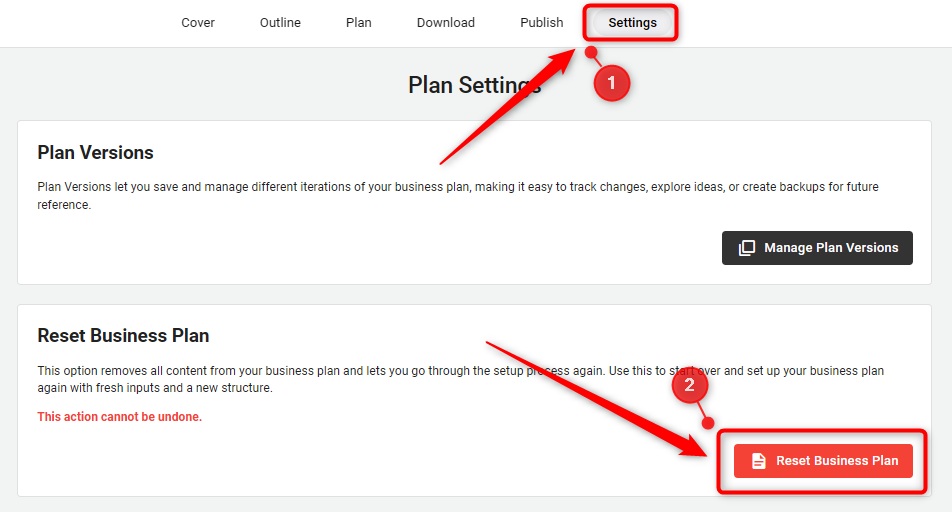 Then navigate to the Settings section and within it, look for the Reset Business Plan option and click on it.