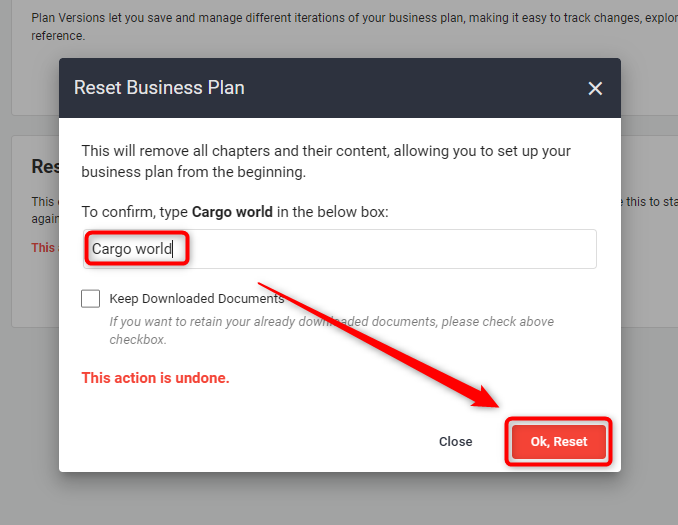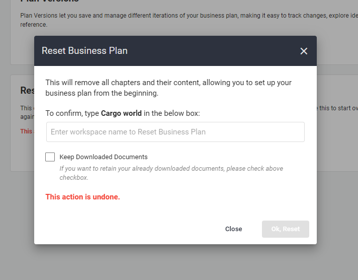 Once you've correctly entered the workspace name, Once you've entered the workspace name correctly, you'll see the Ok, Reset option is enabled, and click on it to reset your business plan.