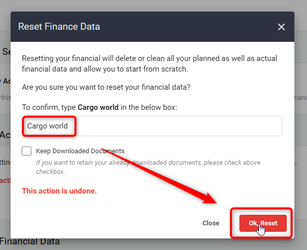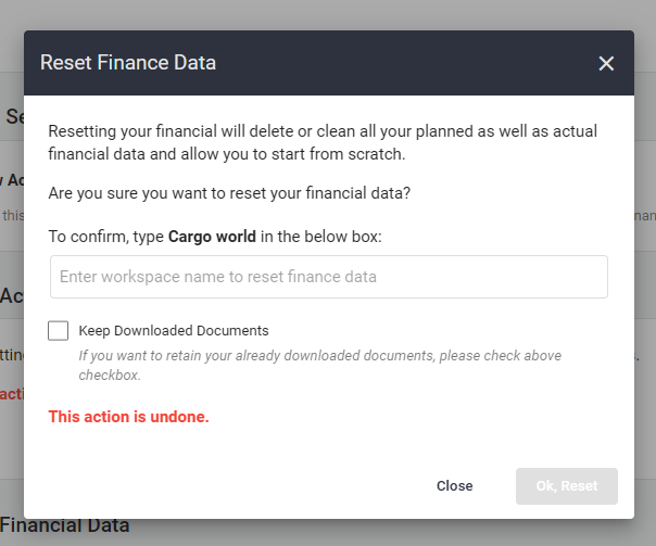 Once you've correctly entered the workspace name, the Ok, Reset option will be activated. Click on it to reset your finance data.
