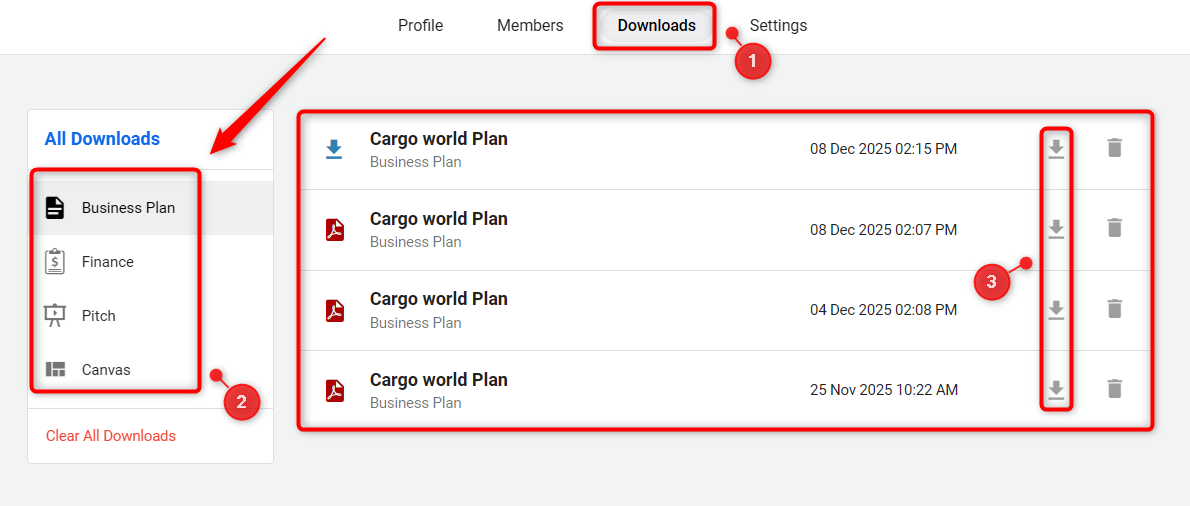 After clicking on "Downloads," you'll be presented with sections for Pitch, Business Plan, and Canvas. Here, you can view all the documents you've downloaded, along with their download dates.