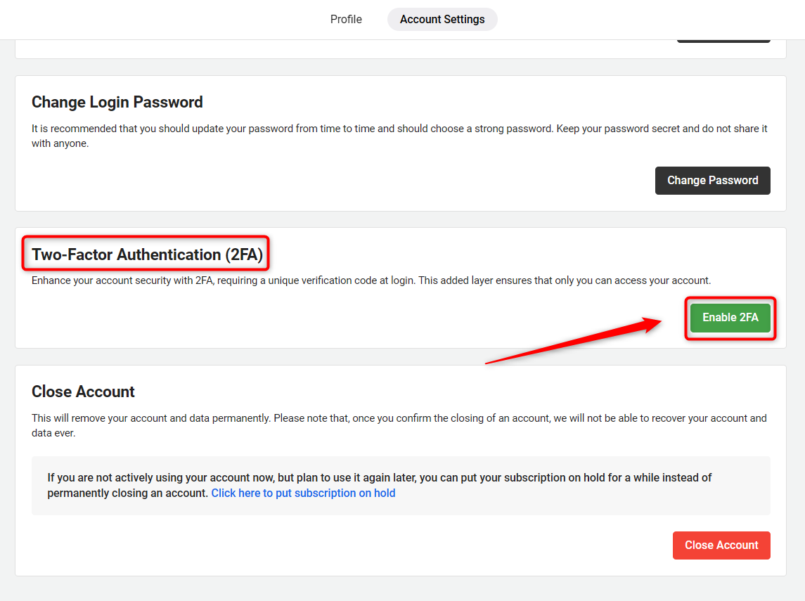 Within Account Settings, find the option labeled Enable 2FA and click on it.