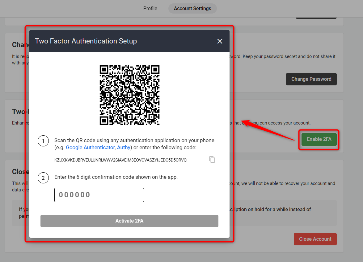 Upon selecting Enable 2FA, a popup window will display a QR code. This QR code is unique to your account and will be used to link your account with the authentication app.