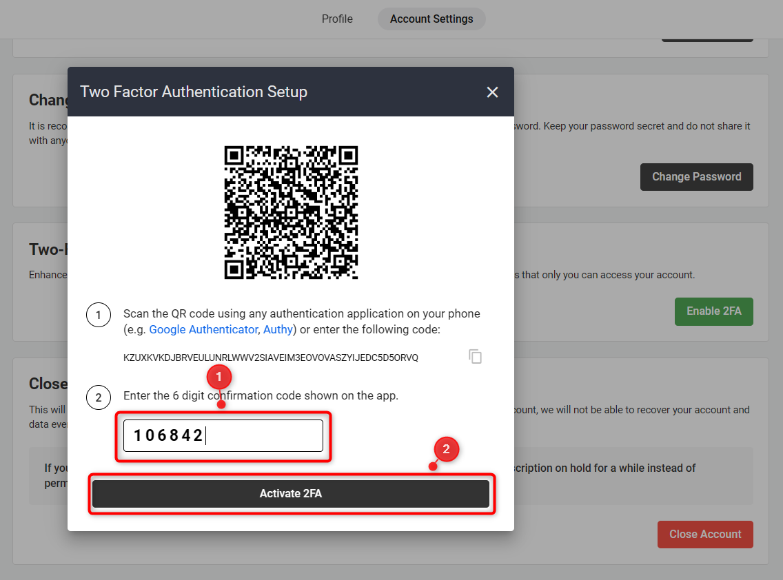 After entering the code, click on Activate 2FA. This action will finalize the activation of two-factor authentication, adding an extra layer of security to your account.