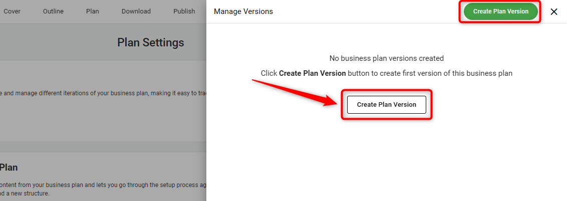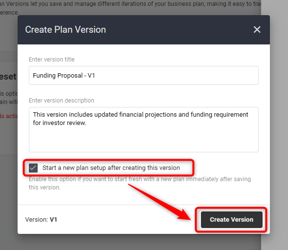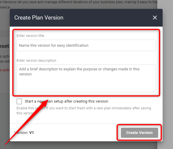 Click on the Create Plan Version button to initiate a new version of your business plan.