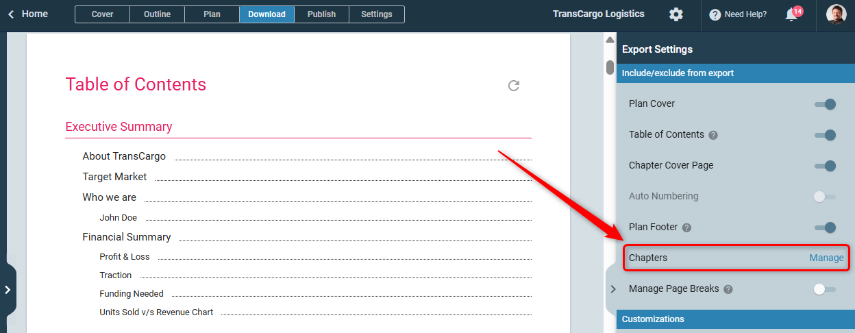 Further customize your plan by managing individual chapters within the Table of Contents through the Chapter Manage section under Export Setting.