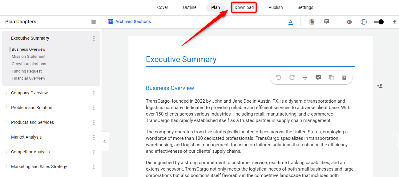 You can view a preview of your Table of Contents in the Download section before finalizing your document, ensuring that all sections are correctly captured and represented as per your business structure. This auto-generated approach ensures that your ToC is always up to date with the latest changes and additions to your plan.