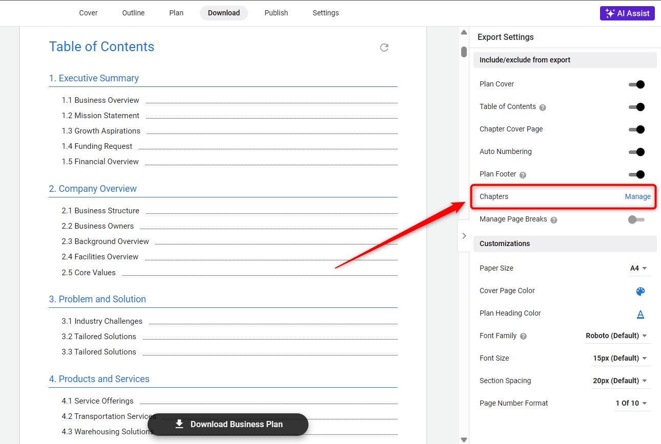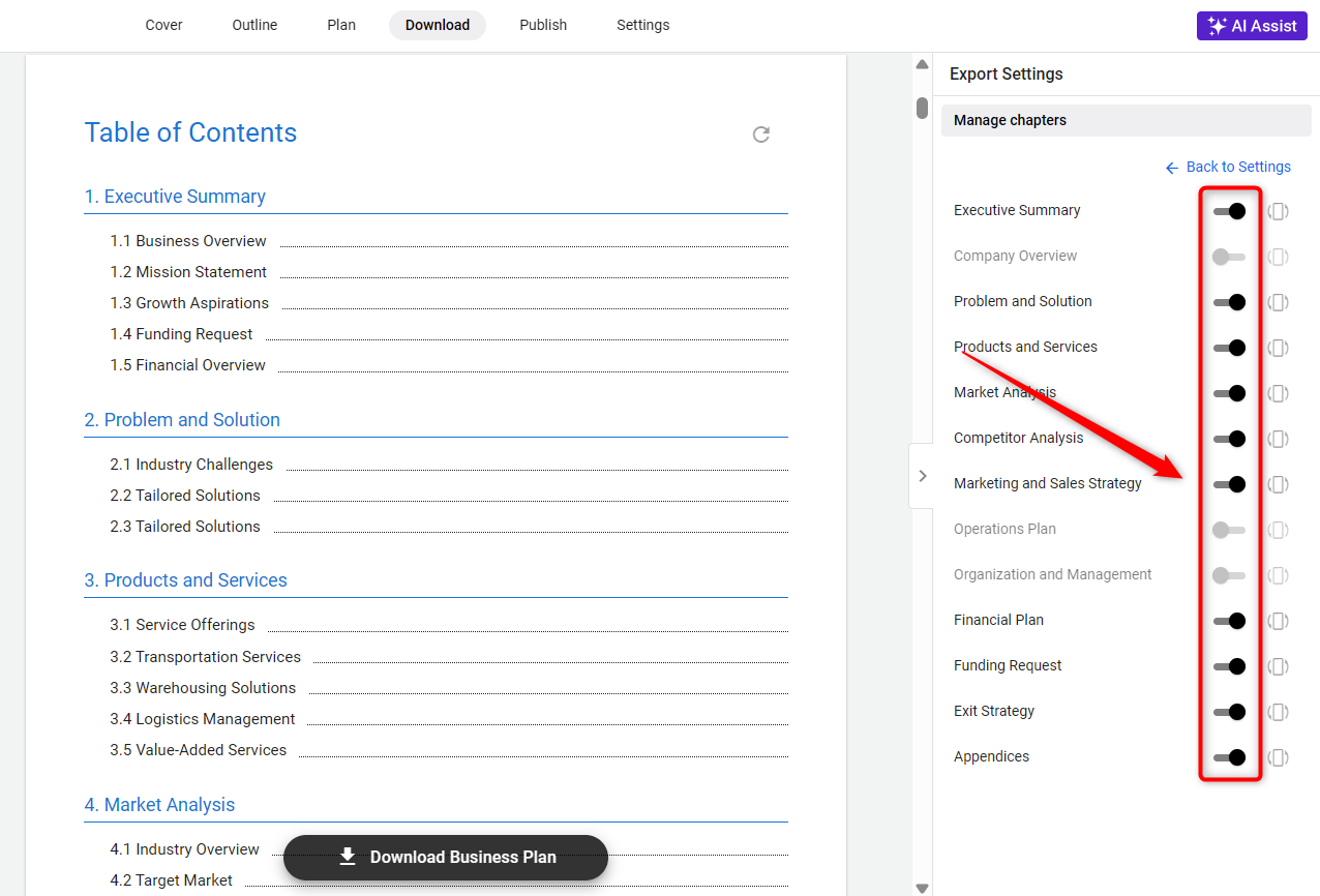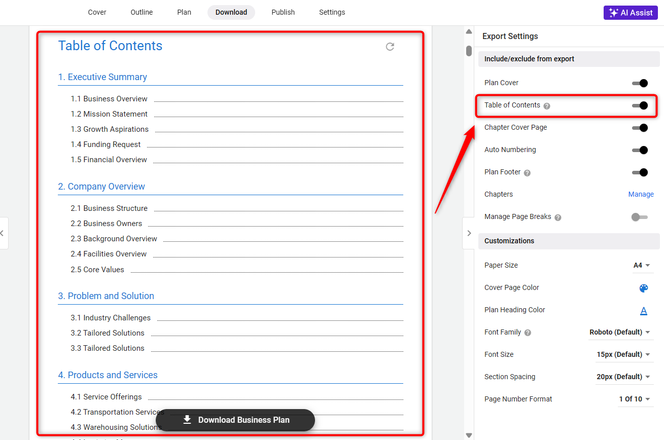 In the download section, preview the Table of Contents for your business plan. Enable or disable the Table of Contents through the export settings toggle, customizing which chapters are included or excluded.