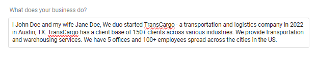 - What does your business do?: Here, you can enter a description of your business, including your services, mission, and target audience.